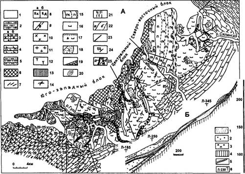 Рис.17. Геологическая схема Тулинского щелочно-ультраосновного комплекса и размещение в его пределах россыпей платиновых металлов (А) и продольный разрез россыпи по долине р.Ингаринга (Б) [Благороднометалльная минерализация..... 1994; Малич, Лопатин, 1996] Рис.А. 1 – четвертичные отложения Хатангского прогиба; 2 – триасовая система (а – средний, б – нижний отделы); 2 – маймечинская свита (меймечиты); 3 – дельканская свита: а – верхнедельканская подсвита (ультраосновные фоидиты); 4 – коготокская свита (трахибазальты, трахиандезитобазальты, базальты); 5 – арыджакгская свита (ультраосновные фоидиты, щелочные пикриты); 6 – комплекс щелочных пород провесов кровли интрузива; 7 – лайковый комплекс маймечинской свиты (пикритовые порфирита); 8 – карбонатиты кальцитовые (а) и доломитовые (б); 9 – фоскориты; 10 – щелочные и нефелиновые сиениты; 11 – нефелиниты, 12 – ийолит-мельтейгиты; 13 – мелилитовые породы; 14 – косьвиты; 15 – расслоенный комплекс рудных верлит-клинопироксенитов; 16 – дуниты; 17 – эндоконтактовые фации дунитов; 18 – ороговикованные эффузивы провисов кровли; 19 – ореолы ороговикования; 20 – участки метасоматических преобразований (флогопитизация, пироксенизация и др.); 21 – зона разлома; 22 – геологические границы: а – достоверные, б – предполагаемые; 23 – дизъюнктивы; 24 – элементы залегания эффузивов; 25 – россыпи золота (а) и осмистого иридия (б), сочетанием знаков показаны комплексные россыпи Рис.Б. 1 – современный аллювий; 2–3 – верхнечетвертичные осадки: 2 – аллювий и водноледниковые, 3 – склоновые; 4 – породы плотика; 5 – продуктивные пласты; 6 – поисковые линии