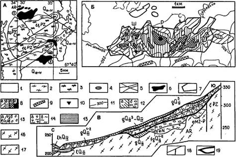 Рис.31. Строение лопаритовых россыпей северного подножья Ловозерского массива: А – схема размещения россыпей Ловозерского массива; Б – план россыпей Сергеваньской группы; В – типовой разрез (по данным В.С.Лихачева, Ловозерская ГРП, 1977 г.) 1 – четвертичные отложения; 2–3 – породы Ловозерского массива (на схеме А): 2 – эвдиалитовые луявриты, 3 – дифференцированный комплекс; 4 – архейские гнейсы; 5 – разрывные нарушения, выраженные в рельефе; 6 – россыпи лопарита (на схеме А); 7 – россыпи, оконтуренные по бортовому содержанию лопарита 2 кг/м3; 8 – мощность рудного пласта, м: а – менее 20, б – 30–30, в – 30–40, г – более 40; 9 – карьеры Ловозерского рудника (карьер Уртитовый, гор.II-7); 10 – Южно-Шамиокская залежь первичных каолинов; 11 – изогипсы; 12–13 – ледниковые образования: 12 – покровного оледенения: а – морена, б – флювиогляциальные, 13 – то же, местного горнодолинного оледенения: а – морена, б – флювиогляциальные; 14 – элювиальные образования: а – неогенового, б – верхнемезозойского-палеогенового возраста; 15 – озерные осадки; 16 – породы Ловозерского массива: а – фениты и породы дифференцированного комплекса массива: луяврит-фойяит-уртиты, б – эвдиалитовые луявриты; 17 – гранито-гнейсы, архейские; 18 – разрывные нарушения. Лопаритовые россыпи; 19 – контур рудного пласта: 1 – россыпи Сергеваньской группы (Ш – Шамиокская, Р – Ревдинская, С – Сергеваньская), 2 – россыпи Сейдозерской группы, 3 – Райяврская россыпь