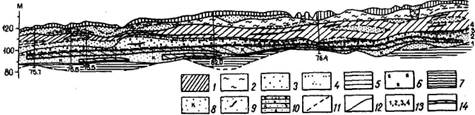 Рис.34. Продольный разрез Кусковско-Ширяевского участка Туганского россыпного месторождения (фрагмент) (по И.Б.Санданову) 1 – суглинок покровный четвертичный; 2 – глины четвертичные и неогеновые; 3–10 – палеогеновые отложения: 3 – песок, 4 – алерит, 5 – глина, 6 – гумусовые вещество, 7 – плитные глины, 8 – тонкозернистые кварцевые пески с каолином, 9 – слабосцементированные «черные» пески с линзами бурых углей, 10 – сливные кремнистые песчаники; 11 – литологические границы; 12 – стратигрфические границы; 13 – номера горизонтов кусковской свиты; 14 – контур рудного пласта