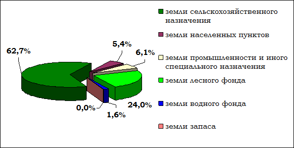 Общая площадь Рыбновского муниципального района в административных границах составляет 140438 га. Среди всех категорий земель в земельном фонде района на 01.01.2008 г. преобладали земли сельскохозяйственного назначения, они составили 88097 га. Значительную долю занимают земли лесного фонда 33770 га. На долю земель промышленности и иного специального назначения приходится 8604 га. Под землями населенных пунктов – 7606 га, под землями водного фонда – 2306 га. Земли запаса занимают незначительную площадь, всего 55 га (рис. 6). Рис. 6. Структура земельного фонда Рыбновского муниципального района
