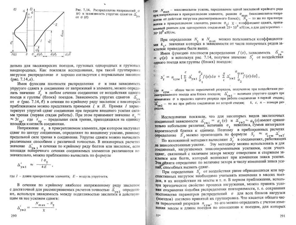 При определении v. значение п. вычисляют путем умножения числа поездов и пассажирских составов, входящих в рассматриваемый блок нагрузки, на число циклов от соответствующей нагрузки. Цену разряда для каждого блока нагрузки определяют по расчетным экстремальным значениям напряжений ат и о., предварительно приведенным к стп(тах> и <7n(jnin) = 0. Расчетные значения напряжений а и а. вычисляют обычным способом с учетом динамических max mm „ ' ■ ", коэффициентов. Вследствие непрямой передачи усилии наблюдается некоторое перенапряжение элементов в зонах их Прикрепления. Повышение в них номинальных напряжений по сравнению со средними значениями, которые определяются обычным расчетом, зависит от доли так называемой непосредственно перекрытой части сечения. Это повышение напряжений учитывают путем умножения расчетных напряжений на коэффициент условий работы m, который принимают в зависимости от величины непосредственно перекрытой части сечения: при непосредственном перекрытии 80 - 90 % сечения прикрепляемого элемента m = 1,04; 60 - 80 % сечения - m = 1,1; 40 - 60 % сечения - m = 1,25 и менее 40 % - m = 1,3. В случае определения величин номинальных напряжений в сечениях по наиболее напряженным рядам заклепок (болтов) "точным" способом, коэффициент гп принимают равным единице. Значительные трудности возникают при оценке режимов нагруже-