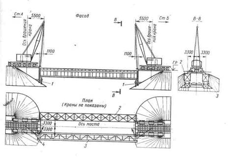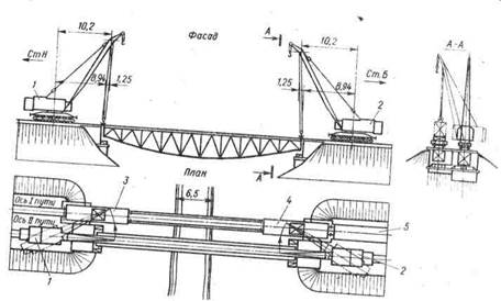 Рис. 8.6. Схема фермоподъемника конструкции Гипротранспути: 1 — ось опорного узла пролетного строения; 2 — домкрат; 3 — переставной столик; 4 — домкрагная балка; 5 — страхующая балка а) на подходах с последующей продольной надвижкой: по времен б) полунавесным или навесным способом: с временными опорами; в) на сплошных подмостях и др. Выбор целесообразного способа замены пролетного строения определяется на основе технико-экономического анализа конкурентоспособных решений с учетом местных условий, режима реки, грузонапряженности участка железной дороги, оснащенности мостостроительной организации и др. Замена пролетных строений комбинированным способом. На практике мостостроительные организации чаще всего используют комбинированный способ замены пролетных строений средних и больших пролетов, включающий их продольные и поперечные передвижки. При этом конструкции заменяют либо попролетно, либо в сцепе — старые пролетные строения сцепляют с новыми на всю длину моста исходя из продолжительности предоставляемых "окон". Технология работ по замене пролетных строений предусматривает: сборку нового 324 пролетного строения на подходе параллельно оси моста; устройство на-каточных приспособлений; устройство тяговых (толкающих) и тормозных приспособлений; продольную (вдоль оси моста) передвижку собранного пролетного строения по временным перекаточным опорам, устраиваемым обычно с применением инвентарных конструкций; поперечную (поперек оси моста) выкатку заменяемого пролетного строения по специальным пирсам, размещаемым, как правило, по концам пролетного строения; поперечную перекатку нового пролетного строения на место заменяемого с предварительным переустройством (при необходимости) подферменных площадок опоры; установку нового пролетного строения на опорные части с предварительным демонтажом на-каточных приспособлений; уборку старого пролетного строения; демонтаж технологических обустройств (временных опор, пирсов и т. д.). Выбор уровня сборки нового пролетного строения как на подходе к мосту, так и в русле реки зависит от высоты моста. В случае небольшой высоты моста, при малых глубинах воды в реке, отсутствии судоходства, слабом ледоходе и др. сборку нового пролетного строения (целесообразно вести в одном уровне со старым. При значительной высоте моста и большой глубине воды в реке монтаж нового пролетного строения обычно ведется в низком уровне с последующей его подъем-. кой домкратами или фермоподъемниками на необходимую высоту. Существующие конструкции фермоподъемников (рис. 8.6) позволяют поднимать пролетное строение на высоту до 30-35 м. Поперечная передвижка старого и нового пролетных строений выполняется в "окно" по тщательно разработанному графику, учитывающему весь набор работ и трудозатраты. Пролетные строения передвигаются поперек оси моста- по специальным пирсам, аналогичным по конструкции временным перекаточным опорам, используемым для продольной надвижки. Для сокращения продолжительности работ применяют различные решения. Например, при замене пролетного строения на эксплуатируемом мосту поперечную передвижку старого и нового пролетных строений осуществляют одновременно, предварительно жестко объединив их между собой. Эта мера позволяет сократить продолжительность "окна" на несколько часов