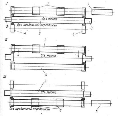 Рис. 8.5. Технологическая схема замены пролетного строения методом поперечных и продольных передвижек: I - П1 — этапы работ; 1 - временные опоры; 2, 5 — соответственно новое и старое пролетные строения; 3 - устой; 4 — пирс; б - положение старого пролетного строения после продольной передвижки меняемых кранов на железнодорожном ходу, использовать и автомо-брйьные краны большой грузоподъемности ("Като", "Либхерр" и др.). Они, работая "с поля", могут ускорить работу и снизить дополнительные расходы, вызванные стеснением движения поездов на путепроводе и городского транспорта под ним. Метод поперечной надвижки пролетных строений. Этот метод применяют при замене больших пролетных строений. Сущность его заключается в том, что старое пролетное строение по специально устраиваемым пирсам сдвигается поперек оси моста (рис. 8.5), а на его место поперечной же передвижкой устанавливается новое пролетное строение, которое может быть смонтировано параллельно оси моста любым из известных в строительстве мостов способов: "* 323
