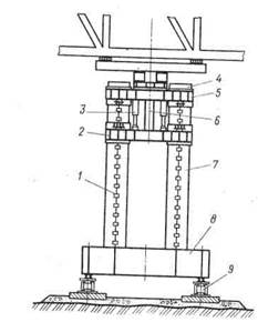 Рис. 8.7. Фермоподъемник, применяемый при реконструкции моста: 1 — окна для опирания обойм через выдвижные вкладыши; 2 — нижние обоймы; 3 — винтовые страховочные устройства; 4 — траверса; 5 —верхние обоймы; 6 — гидравлические домкраты; 7 — трубы-стойки; 8 — продольные рамы; 9 — катки Замена пролетных строений с применением плавучих опор. Этот способ экономически целесообразен при замене нескольких (обычно трех или более) однотипных металлических пролетных строений средних и больших пролетов при интенсивном судоходстве. При таком способе необходимо иметь две плавсистемы: одну для снятия старых (заменяемых) пролетных строений и перевозки их на берег (пирсы) для последующей разборки, а другую для доставки новых пролетных строений в пролет и установки их на постоянные опоры моста. Новое пролетное строение, собранное на берегу, в зависимости от уровня поперечной перекатки по пирсам устанавливается (перегружается) на плавсистему с помощью фермоподьемников или непосредственна на плавучие опоры, введенные между пирсами. Специалистами Мостотреста и Гипростроймоста разработана конструкция фермоподъемника, позволяющая поднимать и перевозить пролетные строения в процессе замены (рис. 8.7). Замена пролетных строений на плаву позволяет экономить материалы на вспомогательных сооружениях и сокращает необходимое "Оконное" время в 2—2,5 раза по сравнению с известными способами продольной и поперечной передвижки. Важное место в процессе замены пролетных строений, определяющем во многом продолжительность "окон", занимают работы по уборке старого пролетного строения. Обычно заменяемое пролетное строение поперечной передвижкой выкатывается со своего места, а затем 1родольной передвижкой выводится за пределы моста по временным 326 опорам с последующей разборкой на берегу. Для эвакуации старого