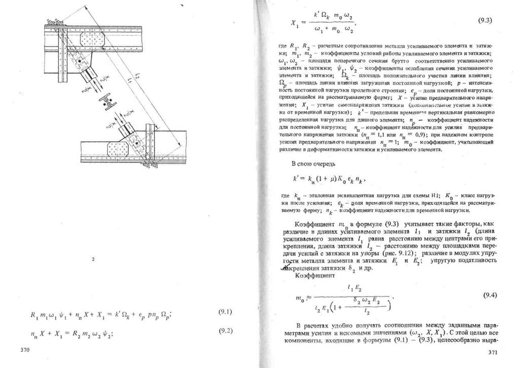 выполняют методом последовательных приближений по следующей схеме: определяют приближенное значение со по формуле (9.8), затем по формулам (9.12) и (9.5) находят Хг и х,; из уравнения (9.17) определяют х и проверяют выполнение условия 0 < х < -— )^~ + Х-Бели х находится за пределами указанной области, то пересматривают значения исходных параметров. По формулам (9.15) и (9.16) вычисляют у t и у2 и проверяют выполнение условий у <1; У2 < 1. При невыполнении первого условия в дальнейшем принимают у'— 1, а при невыполнении второго повторно определяют значение х, приняв в уравнении (9.17) А =\, В — О. Проверяют выполнение условия выносливости усиленного элемента по уравнению (9.10), а для сжаторастяну-тых элементов, кроме того, - класс по устойчивости элемента по формуле (9.9). Важное значение при проектировании усиления предварительно напряженными затяжками имеет правильный выбор исходных параметров усиления: соотношения прочностных характеристик материала усиливаемого элемента и затяжки (г); эффективного коэффициента концентрации напряжений затяжки ((3); упругой податливости закрепления затяжки и др. При выборе материала для затяжки стремятся увеличить г, т. е. отдают предпочтение стали более высокой прочности. В этом случае, кроме повышения прочностных характеристик, улучшаются характеристики цикла нагружения затяжки. Затяжки целесообразно изготавливать из стержневой стали классов С60, С80; анкерное закрепление затяжек гайками наиболее предпочтительно. Для снижения эффективного коэффициента концентрации напряжений резьбу выполняют методом накатки с повышенным радиусом закругления в основании резьбы. На выносливость затяжки большое влияние оказывает упругая податливость закрепления затяжки 5: чем выше податливость закрепления, тем более благоприятный цикл нагружения затяжки в связи с увеличением р, а следовательно, и повышением у2. На эффективность усиления оказывает влияние и доля усилия от постоянной нагрузки: по мере ее увеличения растет эффективность усиления. Поэтому усиле-ний^лементов главных ферм больших пролетов, как правило, эффективнее, чем малых. Особое внимание при проектировании усиления предварительно напряженными затяжками нужно обращать на прикрепления усиливаемых элементов. После усиления в заклепочных и болтовых соединениях возрастут сдвиги по поверхностям контактов, что приведет к соответствующему ускорению износа и расстройства соединений. Для замедления процесса износа заклепочные соединения в усиливаемых элементах превращают в клепано-болтовые, заменяя часть заклепок в крайних поперечных рядах высокопрочными болтами. Число высокопрочных болтов определяют расчетом.