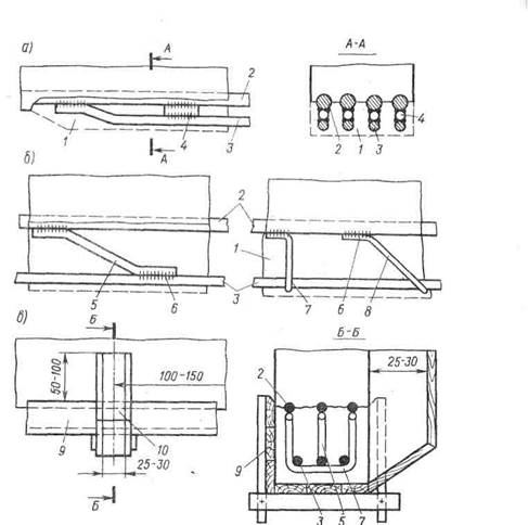9.4. Усиление главных ферм и связей Усиление главных ферм наиболее часто выполняют с использованием таких способов^как увеличение поперечных сечений элементов и изменение схемы системы ферм. При усилении главных ферм представляются широкие возможности искусственного регулирования усилий в элементах ферм путем изменения статической схемы, предварительного напряжения элементов, изменения положения опорных узлов в вертикальной плоскости неразрезных ферм, разгрузки (догрузки) пролетного строения при усилении и др. Это позволяет создавать наиболее благоприятные условия для использования несущей способности усиливаемых и вновь добавляемых элементов, а также конструкции в целом. Выбор схемы и способа усиления делают на основании анализа состояния конструкции, расчетной грузоподъемности и деформативности. В случае Необходимости значительного усиления поясов главных ферм, повышения вертикальной жесткости пролетного строения устраивают шпренгели (рис. 9.5, а) или так называемый третий пояс (рис. 9.5, б). Превращение разрезных ферм в неразрезные (рис. 9.5, в) и устройство дополнительной опоры (рис. 9.5, г) позволяет при определенных условиях Намного увеличивать их грузоподъемность. При изменении статической схемы происходит перераспределение усилий в элементах усиливаемой конструкции. Для более рационального перераспределения усилий можно использовать, кроме того, их регулирование путем предварительного напряжения элементов шпренгеля, элементов третьего пояса и изменение уровня опорных частей. При усилении главных ферм весьма эффективно применение предварительно напряженных затяжек из высокопрочной стали. При этом наиболее полно используются прочностные свойства металла затяжек и усиливаемых элементов, сравнительно просто достигается рациональное распределение усилий в элементах, почти полностью исключается расклепка существующих соединений, и поэтому работы по усилению можно выполнять практически без перерыва движения поездов. Рис. 9.5. Схемы усилеНиз «- подведением шпр^™*15"*1* ФерМ С шме"е"ием системы- Разрезных ферм в HePa3pe3^Ief;^7Гр™Ме^РлеоТЬеГ° "^ ' ~ единением Рис. 9.6. Схемы усиления главных ферм предварительно напряженными затяжками: а, б - при поэлементном предварительном напряжении; в, г — с изменением статической схемы: д- неразрезной фермы (затяжки выделены жирными линиями) Усиление по схемам, показанным на рис. 9.6, а и б, производят путем предварительного напряжения затяжками каждого подлежащего усилению элемента (поэлементное предварительное напряжение). При этом в других элементах практически не возникают усилия Предварительного напряжения. Усиление, показанное на рис. 9.6, в я г, связано с изменением статической схемы, поэтому предварительное напряжение, создаваемое затяжками, распределяется на большое число элементов системы. На рис. 9.6, д представлен вариант усиления неразрезной фермы. Здесь, как и в любой статически неопределимой системе, предварительное напряжение затяжек вызывает усилия практически во всех основных элементах. Однако наибольшие усилия от предварительного напряжения будут создаваться в элементах поясов, примыкающих к затяжкам. Изменение системы главных ферм почти всегда сопровождается усилением отдельных элементов ферм и их прикреплений. Наиболее распространенным способом усилен