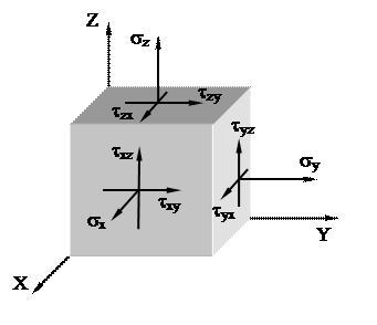 В окрестностях произвольной точки напряженного тела выделим элементарный объём в форме прямоугольного параллепипеда со сторонами dx, dy, dz. На каждой из граней действует по три составляющих напряжения: нормальное напряжение и два касательных (рис.20).
