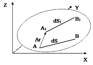 где U, V, W – перемещения вдоль координатных осей Х, У, Z. Теперь возьмем отрезок АВ бесконечно малой длины dS с направляющими косинусами (l, m, n). Изменение длины отрезка под нагрузкой dS1 - dS = DdS называется абсолютным удлинением или приращением.