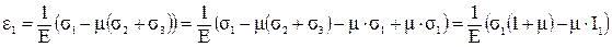 При одноосном напряженном состоянии (рис.32) деформации по трем осям будут равны:
