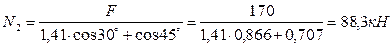 Подставляем в уравнении (2) выражение (3) N1 и получаем: 1,41N2 × cos30°+ N2 × cos45° - F = 0