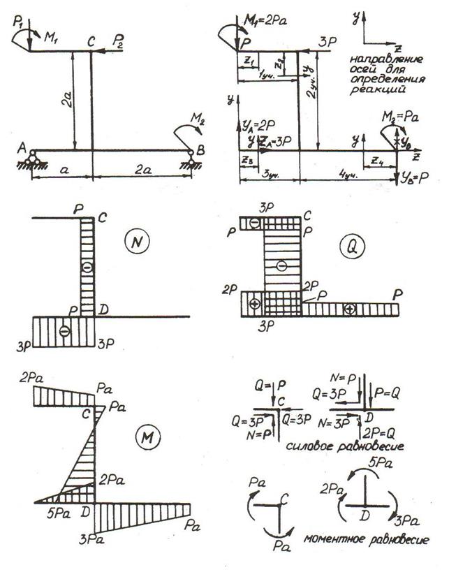 Построить эпюры нормальных сил N, поперечных сил Q и изгибающих моментов М для плоской рамы, изображенной на рис. 22а. Принять: P1=P, P2= 3 P, М1= 2 Ра, М2=Ра.