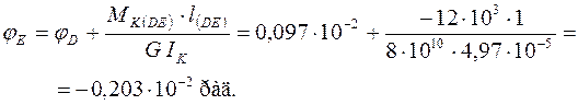 Из двух полученных значений d в качестве ответа берём больший (d = 0,142 м = 142 мм). Округляем его до ближайшего большего стандартного значения: d = 150 мм. 5. Строим эпюру углов закручивания (рис. 36в). Углы поворота сечений будем определять относительно сечения А, так как угол поворота этого сечения равен нулю. Углы поворота других сечений (В, C, D, E) равны сумме углов закручивания участков вала, расположенных между сечением А и сечением, угол закручивания которого определяется