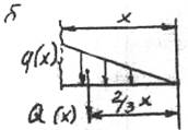 На расстоянии x от свободного конца (рис. 1,а) проведем произвольное сечение. Равнодействующее усилие Q(x) будет приложено в центре тяжести треугольника (рис. 1,6) - в точке пересечения медиан (на расстояния 2/3 длины, отсчитываемой от острого угла). Величина Q(x) равна площади треугольника: