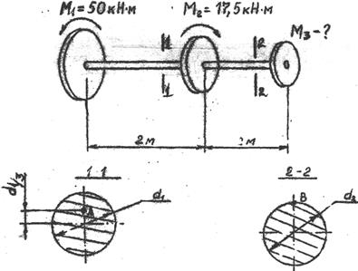Решение. Вал круглого поперечного сечения вращается с постоянной угловой скоростью w=const. На вал насажены три шкива с внешними монетами: М1 =50 кН·м, М2 =17,50 кН·м, и М3 (модуль и направление вращения М3 по условию задачи не заданы). Диаметры вала на участках I и 2 различны: d1=2d2.