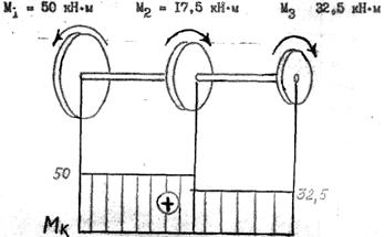 Внешний момент М1 уравновешивается крутящим моментом MК1, т.е MК1 = M1 = 50 кН·М. Сделав сечение на втором участке и рассмотрев равновесие отсеченной части (рис. б), получим: M1- M2- MК2=0 MК2= M1- M2=50-17.5=32.5кН·м