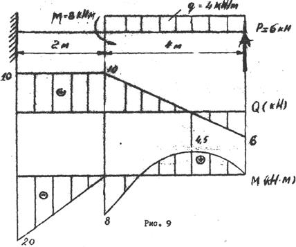Подставив в формулы численные значения, строим эпюры М и Q так же как и в задаче 3 (рис. 9). Для консольных балок эпюры строят аналогичным образом.