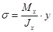 Таким образом, нормальные напряжения в произвольной точке поперечного сечения прямо пропорциональны её расстоянию При вычислении Возвращаясь к рис. 2.6.8.Б, заметим, что нейтральная ось (она принята за координатную ось) делит поперечное сечение бруса на две части, в одной из которых возникают растягивающие, а в другой – сжимающие напряжения. В точках, лежащих на самой нейтральной оси, нормальные напряжения равны нулю. Таким образом, наряду с определением нейтральной оси как линии пересечения нейтрального слоя с плоскостью поперечного сечения можно дать и другое: нейтральной осью или нулевой линией называется геометрическое место точек поперечного сечения бруса, в которых нормальные напряжения равны нулю. Формула (2.6.2.) выводится для случая чистого прямого изгиба бруса. При поперечном прямом изгибе предпосылки, положенные в основу ее вывода, нарушаются: поперечные сечения бруса вследствие возникновения в них касательных напряжений искривляются (гипотеза Бернулли несправедлива); кроме того, в этом случае имеет место, хотя и весьма незначительное, взаимное надавливание волокон. Тем не менее, как показывают экспериментальные и точные теоретические исследования, эта формула дает значения нормальных напряжений и для случая поперечного изгиба с точностью, вполне достаточной для практических расчетов. Формулой (2.6.2.) можно пользоваться во всех случаях прямого изгиба, понимая под
