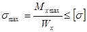 2.6.5. Балки рассчитывают на прочность по наибольшим нормальным напряжениям, возникающим в их поперечных сечениях. При поперечном изгибе балок наряду с нормальными, как известно, возникают и касательные напряжения, но они в подавляющем большинстве случаев невелики и при расчетах на прочность не учитываются. В коротких брусьях тонкостенного профиля (например, двутавров) или брусьях, нагруженных большими сосредоточенными силами близко от опор, касательные напряжения могут быть весьма значительными, поэтому для таких балок дополнительно к основному расчёту на прочность по нормальным напряжениям выполняют расчёт по касательным напряжениям. Расчет балок из пластичных материалов. Прочность балки из пластичного материала обеспечена, если наибольшие по абсолютному значению нормальные напряжения, возникающие в опасном поперечном сечении, не превышают допускаемых. Для балки, поперечные размеры которой по всей длине постоянны (пока только такими балками и ограничимся), опасное сечение то, в котором возникает наибольший по модулю изгибающий момент. Наибольшие нормальные напряжения возникают в точках (будем называть эти точки опасными) опасного поперечного сечения, максимально удаленных от нейтральной оси: