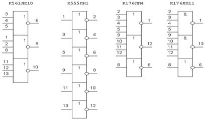 Але на практиці елементи, що реалізують логічні функції не існують в вигляді окремих вузлів, а входять до складу корпусу певної мікросхеми. На рисунку 1 наведені приклади умовного позначення логічних елементів різних серій. Рис.1а