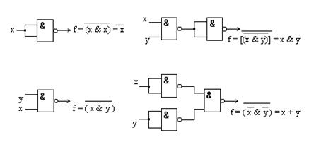 Рис.1б Мікросхеми, які виконують найпростіші операції (І, І-НІ, АБО, АБО-НІ та ін.), містять у своєму корпусі декілька незалежних логічних елементів (вентилів), пов’язаних тільки живленням. При складанні схеми дискретного пристрою трапляється, що окремі логічні елементи мікросхеми залишаються вільними. Це приводе до зайвих енергетичних затрат. Щоб цього по можливості уникнути треба намагатись певні фрагменти схеми будувати на одному базисі. Базис – це система логічних операцій, що реалізуються однією мікросхемою. Існують такі базиси: Базис 1 утворює система функцій І, АБО, НЕ ( Базис 2 утворює система функцій І, НЕ( Базис 3 – АБО, НЕ( Базис 4 утворює функцію Шеррера І-НЕ ( Базис 5 утворює функцію Пірса АБО-НЕ ( Якщо базис 1 вважається збитковим, то базиси 4 і 5 – мінімальними. Отже, для реалізації складних ЛФ, крім мінімізації функції треба намагатися витратити найменшу кількість корпусів логічних елементів. Для цього треба структурну формулу привести до такого вигляду, щоб вона містила тільки елементи І-НЕ або тільки АБО-НЕ. Тоді перехід від структурної формули до функціональної схеми не буде складним. В будь-якому випадку при побудові логічної схеми в базисі І-НЕ на основі логічної функції, поданої в МДНФ, необхідно скрізь замість елементів І і АБО вставити елементи І-НЕ. При побудові логічної схеми в базисі АБО-НЕ на основі МКНФ замість елементів І і АБО вставити елементи АБО-НЕ. На рисунку 2 приведені приклади універсальності вентилів І-НЕ і АБО-НЕ. Вони демонструють, як можливо дію будь-якої логічної функції подати через ці функції.