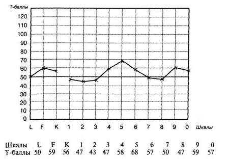 Гончарова А. А. Пол женский. Возраст 40 лет. Образование высшее. Врач. Код профиля 42'7083-96/ 5 FKL. Результаты тестирования достоверны. Общая характеристика профиля: акцентуация по неврастеническому типу. Смешанный тип реагирования. Пассивно-страдательная позиция. Активность снижена в связи с неблагоприятной ситуацией. Уход от активности в ситуации неуспеха и недоброжелательности окружающих. Связанное с неблагоприятной ситуацией ограничение социальной активности. Мотивационная направленность: избегание ситуаций, грозящих неуспехом. Уход от конфронтации. Высокая мотивация избегания стрессов и конфликта. В жизненно важных ситуациях и при благоприятном стечении обстоятельств проявляется мотивация достижения цели. Неустойчивый баланс между стремлением к сохранению контактов с окружением и утверждением своих позиций. Сниженный фон настроения, повышенная тревожность. Склонность к страхам и беспричинной озабоченности многочисленными проблемами. Стремление сдерживать свои эмоции. Настроение легко улучшается при благоприятном стечении обстоятельств. Сензитивно-индивидуалистический тип реагирования, а также тревожно-мнительный и интровертный (обращенность в мир внутренних переживаний). При этом временами отмечается выраженная импульсивность. Стиль общения — отказ от удовлетворения своих интересов ради других при достаточно выраженной амбициозности. Болезненная реакция на императивный стиль общения со стороны других. Избирательность в контактах. Общение легче дается в сфере привычных контактов. В ситуации уязвленного самолюбия могут проявляться реакции недовольства и критичность высказываний в отношении мнения окружающих, повышенная обидчивость. В построении отношений с людьми проявляется гибкость. Умение менять стиль поведения в зависимости от круга общения. Женственный стиль межличностного поведения сочетается с определенной непокорностью. Реакция на стресс: тормозимые тенденции и неуверенность, блокировка действий, резкое снижение настроения и жизненного тонуса, реакция тревоги и чувство страха сочетаются с импульсивностью и склонностью к рискованным поступкам, а также элементами демонстративности. Нередко выраженная иррациональность. Защитные механизмы — оттормаживание эгоистических потребностей ради сохранения бесконфликтных отношений с окружением. Ограничительное поведение, сужающее диапазон активности. Временами проявляется уход от общественной активности в мир субъективно значимых интересов. При этом остается чувство уязвленного самолюбия в связи с нереализованными намерениями. Уход от реальных проблем. Стремление дать ситуации свое собственное объяснение, не всегда совпадающее с общепринятым. Тип восприятия — вербально-аналитический когнитивный стиль, повышенная рефлексивность, тенденция к преувеличению имеющихся проблем. Тенденция к застреванию на мелочах и повторной перепроверке сделанного, чтобы избежать ошибки. Неустойчивость уровня активного внимания. В известной степени проявляется также целостный интуитивный тип восприятия. Отмечается умение оценить юмор. Ведущие потребности: потребность в глубокой и постоянной привязанности, в понимании и сочувствии, в ограничении контактов и избегании конфликтов. Потребность в сохранении собственной индивидуальности, а также в 
