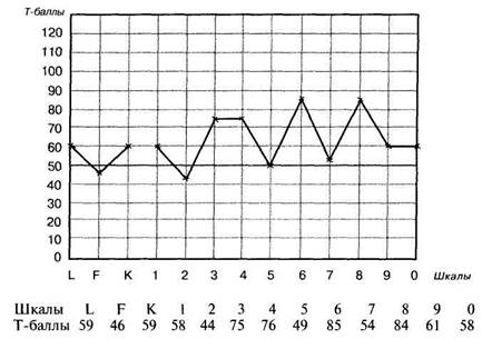 Спивак П. В. Пол — мужской, возраст — 20 лет, образование — незаконченное высшее, студент театрального училища. Трудности адаптации в коллективе. Код профиля 68"34" 190-/2 LKF. Результаты теста достоверны. Имеется тенденция к вытеснению психологических проблем. Общая характеристика профиля: резко заостренные особенности характера вплоть до уровня психопатических черт. Позиция агрессивная. Гиперстенический тип реагирования. Выраженная мотивация самоутверждения и достижения успеха, а также субъективно-иррациональная. Противоречивое столкновение высокой мотивации достижения успеха со столь же высокой тенденцией привлечь внимание к своей особе и хорошо выглядеть в глазах окружающих. Эмоциональный фон: упрямство, агрессивность. Аффективная насыщенность переживаний. Выраженность эмоциональных проявлений, внезапно возникающих и полярно меняющихся. Умеренно оптимистичный настрой. Неустойчивость эмоций. Яркость проявления чувств без глубины и теплоты переживаний.