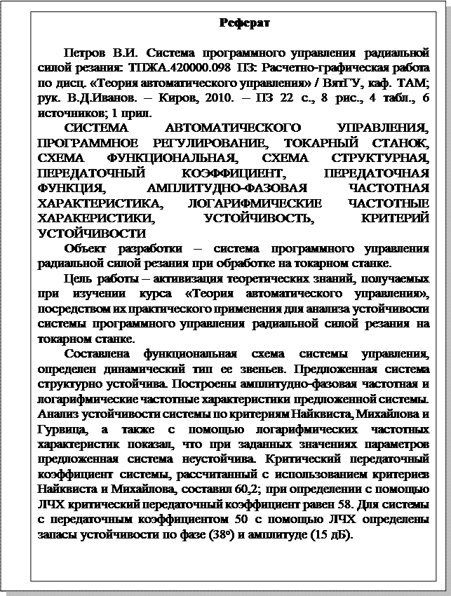 При выполнении расчетно-графической работы необходимо: а) ознакомиться с описанием работы предложенной системы, уяснить принцип ее работы, выявить объект управления, управляющее воздействие и получаемый результат; б) составить функциональную схему предложенной САУ; в) определить динамический тип звеньев предложенной САУ, записать их передаточные функции; г) составить структурную схему САУ; д) определить структурную устойчивость системы; е) используя правила преобразования структурных схем, привести структурную схему САУ к эквивалентной схеме, состоящей из одного звена, охваченного обратной связью; ж) исследовать САУ на устойчивость, определить критический передаточный коэффициент и запасы устойчивости с помощью асимптотических логарифмических амплитудно-частотных (ЛАЧХ) и логарифмических фазовых частотных характеристик (ЛФЧХ); з) исследовать САУ на устойчивость, определить критический передаточный коэффициент и запасы устойчивости с помощью критерия Найквиста; и) исследовать САУ на устойчивость, определить критический передаточный коэффициент с помощью критерия Михайлова; к) исследовать САУ с помощью алгебраического критерия устойчивости (критерий Гурвица); л) сравнить результаты исследования САУ на устойчивость различными методами и сделать вывод об устойчивости предложенной САУ. Выполненная работа оформляется в виде пояснительной записки. Пояснительная записка оформляется в соответствии с требованиями стандартов ВятГУ /1/. Пример оформления титульного листа, являющегося ненумеруемым первым листом пояснительной записки, приведен на рисунке 1.1. Далее приводится реферат. Пример оформления реферата приведен на рисунке 1.2. Листы задания и реферата не входят в общую нумерацию листов пояснительной записки. Вторым листом пояснительной записки является содержание, на этом же листе приводится основная надпись для текстовых документов (форма 2 ГОСТ 2.104‑68). Пример оформления этого листа приведен на рисунке 1.3. Остальные листы пояснительной записки должны содержать основную надпись по форме 2а ГОСТ 2.104-68. Шифр, присваиваемый пояснительной записке, должен соответствовать Классификатору ЕСКД и имеет структуру ТПЖА.420000.ХХХ ПЗ, где класс (42) соответствует классу «Устройства и системы контроля и регулирования параметров технологических процессов» Классификатора ЕСКД, подкласс (0) соответствует подклассу «Документы, нормы, правила, требования, методы» указанного класса. В позициях, отмеченных знаком ХХХ, указываются три последние цифры номера студенческого билета студента. Присвоенный шифр в обязательном порядке проставляется на титульном листе и в основной надписи по форме 2; на остальных листах пояснительной записки шифр допускается не указывать. В пояснительной записке должен быть отражен каждый пункт задания с приведением всех требуемых схем, необходимых математических выкладок и соответствующих комментариев к ним. Следует обратить особое внимание на тщательность выполнения графических материалов - годографов и логарифмических характеристик, которые должны выполняться строго в масштабе, на миллиметровой бумаге (логарифмические характеристики - на бумаге с полулогарифмическими координатами). При анализе устойчивости кривая Михайлова может быть построена ориентировочно по точкам ее пересечения с ко
