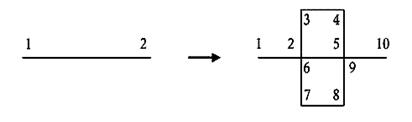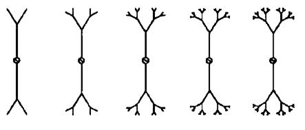 Цифры показывают способ обхода данной кривой. При такой геометрии неизбежны две точки соприкосновения 2-6 и 5-9. В результате исходный квадрат преобразуется так, как показано нижнем рисунке. Затем каждый из отрезков образовавшейся фигуры длиной в 1/3 преобразуется подобным же образом, и так до бесконечности. В результате возникает самоподобная непрерывная кривая, плотно заполняющая квадратную область с площадью, равной 2. Другой тип фрактал, который можно использовать в качестве диполя - это рекурсивное дерево (рис.4). Фрактал образуют из простого монополя путем последовательного разбиения его вершин на две ветви под заданным углом (до