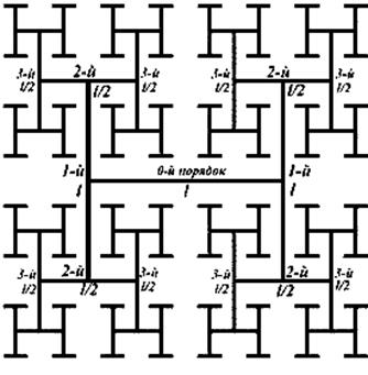 Весьма близко по своим свойствам к антенне на основе фрактала Коха- диполь, сформированный по закону ломаной Германа Минковского. При построении этой антенны вместо системы треугольников на прямой формируются меандры убывающих размеров (рис.2).