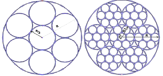 И наконец, кольцевой тип, который формируется следующим образом: внутри базового элемента нулевой итерации размещены 7 колец с радиусом в три раза меньше исходного элемента. Остальные параметры (ширина и толщина кольца базового элемента) оставлены без изменений. Центры 6 маленьких окружностей расположены на расстоянии R*2/3, в вершинах шестиугольника. Центр 7-й окружности совпадает с центром основной антенны. Далее в радиус каждой из 7 окружностей вписываются окружности втрое меньше предыдущего радиуса. Таким образом, полученная модель предложена на рис. 6.