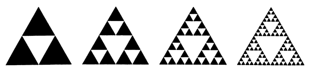 Далее рассмотрим решето Серпинского. Процесс формирования такого фрактала показан на рис.8, на первом шаге состоит в удалении из исходного треугольника центрального треугольного сегмента с вдвое меньшей высотой. В образующихся новых треугольниках на втором шаге снова удаляют центральные части, и далее последовательно повторяют данную процедуру требуемое количество раз.