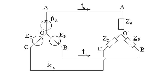 Симметричной трёхфазной цепью называется цепь, в которой действует симметричная система ЭДС и комплексные сопротивления фаз нагрузки равны между собой. Если в симметричной цепи действует симметричная система ЭДС, то система токов также симметрична при соединении звездой (рис.1.).
