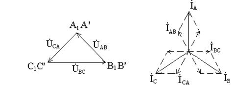 При соединении треугольником (рис.2.) фазные обмотки генератора и нагрузки соединяются таким образом, чтобы 'начало' одной обмотки образовывало с 'концом' другой обмотки общую точку. Общие точки каждой пары обмоток генератора соединяются с общими точками каждой пары ветвей нагрузки линейными проводами. Схемы соединения обмоток источника питания и нагрузки не зависят друг от друга. В одной и той же цепи могут быть источники питания и приёмники (фазы нагрузки) с разными схемами соединений.