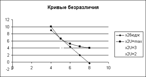 Далее составим таблицу с допустимым множеством значений и построим кривые безразличия и прямую бюджетного ограничения.