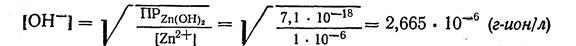 Пример 3. При какой величине рН осаждение гидроксида цинка будет практически полным? Решение. 1. Из уравнения произведения растворимости гидроксида цинка Zn(ОН)2 находим концентрацию [ОН-], учитывая, что осаждение считается полным, если концентрация осаждаемого иона не будет превышать 1 · 10-6 г-ион/л.