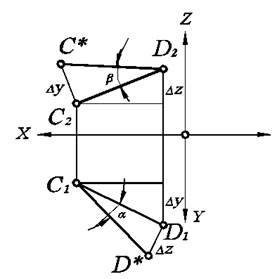 Рис. 2.5. Определение натуральной величины отрезка прямой способом прямоугольного треугольника. На нем, отложив отрезок длиной Dz, получим точку D*. После соединения точек D* и С 1 получаем прямоугольный треугольник С 1 D 1 D *, в котором С 1 D * - натуральная величина отрезка СD, a - угол наклона отрезка СD к плоскости П 1. Для определения угла наклона к плоскости П 2 проведем аналогичные построения на фронтальной проекции. Здесь С*D 2 – натуральная величина СD, b - угол наклона СD к плоскости П 2.