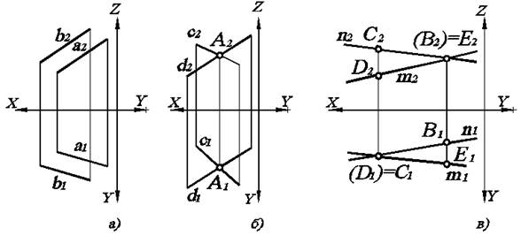 Рис. 2.6. Двухкартинный комплексный чертеж прямых, занимающих по отношению друг к другу следующее положение: а) а êêb; б) с Ç d; в) n ¸ m
