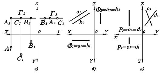Рис. 2.2. Проецирующие прямые на комплексном чертеже: а) горизонтально-проецирующая прямая; б) фронтально-проецирующая прямая; в) профильно–проецирующая прямая.