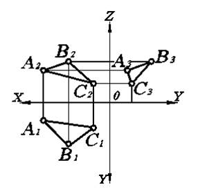 Плоскостью общего положения называется плоскость, не перпендикулярная и не параллельная ни одной из плоскостей проекций, а значит, расположенная под произвольным углом к каждой из них. У такой плоскости все проекции будут плоские фигуры. Например, если плоскость общего положения задана плоской фигурой (треугольником), то все три проекции ее будут треугольниками (рис. 3.4).