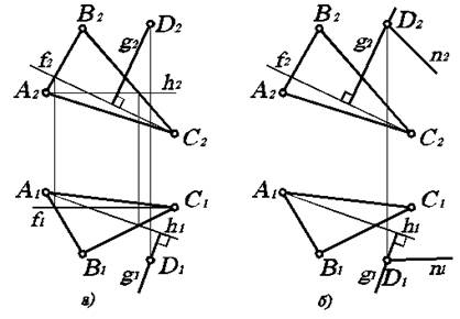 Вопрос перпендикулярности геометрических объектов начинаем с рассмотрения перпендикулярности прямой и плоскости, так как остальные сочетания зависят от этого признака. а). Прямая перпендикулярна к плоскости, если она перпендикулярна к двум пересекающимся прямым, лежащим в этой плоскости, одна из которых фронталь, а другая горизонталь. Хотя для перпендикулярности вполне достаточно, чтобы указанными пересекающимися прямыми были любые прямые в данной плоскости, однако только горизонталь и фронталь позволяют получить без искажений проекции прямого угла, образованного перпендикуляром к плоскости и фронталью (на П 2) и перпендикуляром к плоскости и горизонталью (на П 1). Тогда очевидно, что горизонтальная проекция этого перпендикуляра расположена под прямым углом к горизонтальной проекции горизонтали, а фронтальная проекция - под прямым углом к фронтальной проекции фронтали.