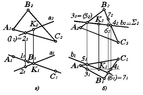 Задачу на пересечение прямой и плоскости можно решать с помощью вспомогательной секущей плоскости, которая должна удовлетворять следующим условиям: а) быть плоскостью частного положения, так как именно плоскость частного положения проецируется на соответствующую плоскость проекций в виде прямой; б) проходить через прямую, точку пересечения которой с плоскостью мы отыскиваем. А. Рассмотрим сначала частный случай. Пусть плоскость занимает частное положение в пространстве, например, является горизонтально - проецирующей и задана треугольником АВС (рис. 3.8 а). Необходимо найти точку пересечения ее с прямой а, заданной произвольно. Поскольку на П 1 горизонтально–проецирующая плоскость вырождается в прямую S1, то горизонтальной проекцией точки пересечения будет К 1. Далее по линии связи на прямой а 2 (очевидно точка пересечения К принадлежит прямой а) найдем фронтальную проекцию К 2 точки пересечения. Осталось определить видимые участки прямой а, поскольку на П 2 часть указанной прямой будет закрыта от наблюдателя плоскостью DАВС. Для этого необходимо рассмотреть точку, где пересекаются фронтальные проекции а и какой-либо прямой (например, АС), лежащей в плоскости DАВС. Обозначим эту точку 12. Но пересекаться прямая а и DАВС могут только в одной точке, которую мы отыскали (К 2). Все остальные точки будут точками, где они скрещиваются. Следовательно, прямая а и АС скрещиваются в пространстве. Значит, все точки, где пересекаются их проекции, будут конкурирующими, а именно 12=22. Тогда на П 1 имеем по линии связи 11Î А 1 С 1 и 21 Î а 1. Видимой является точка 2, которая принадлежит прямой а. Это сохраняется до точки пересечения К 2. Затем, естественно, участок прямой а будет невидим (обозначается пунктирной линией) до выхода из-под плоскости DАВС. Теперь задачу можно считать полностью решенной.