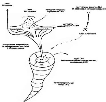 Риг. 12. Система конденсированного опыта (СКО). Первый этап такой подготовки — это интегративные техники, ориентированные на разрушение, аннигиляцию психотравмирующего опыта и, тем самым, устранение непреодолимой стены между сознанием и подсознанием. Вначале очень кратко рассмотрим наиболее известные современные западные методики, их преимущества и недостатки. Как уже говорилось, все эти техники базируются на специальных дыхательных приемах и по сути основаны на упрощенных и адаптированных к современному человеку индийских и китайских методах психотрансформации. Различные современные интегративные техники в основном отличаются используемыми методиками дыхания и музыкальным сопровождением, характером взаимодействия погружаемого в измененные состояния сознания (голонавты) и его помощника, установкой на проработку мышечных или глубинных психологических переживаний. Так, в одной из первых подобных техник редерсинг погружения, как правило, проводится без музыки, и внимание акцентируется на мышечных ощущениях. При этом во время сеанса допускается разговор между голонавтом и помощником. Тип дыхания жестко регламентирован: это интенсивный, активный вдох и максимально расслабленный выдох без задержек (связное дыхание), в ходе сеанса меняются только меты и глубина дыхания (от максимально быстрого и глубокого до почти незаметного). Одна из наиболее совершенных интегративных техник — голотропное дыхание или пневмокатарсис, созданная С. Грофом, основной акцент делает на изменение психологических установок голонавта, расширение его представлений о природе реальности. При этом техника дыхания не регламентируется, задается только его интенсивность и темы. Общение голонавта и помощника осуществляется только через заранее условленный язык прикосновений, словесный контакт строжайше запрещен, так как активация речевых зон мозга автоматически выбрасывает голонавта из глубинных слоев бессознательного. В этой методике очень большая роль отводится музыке. Для сеансов используются специально подобранные программы музыкальных произведений, включающие как современную, так и классическую симфоническую музыку, традиционную музыку Индии, Китая и других древних цивилизаций. При этом воспроизведение музыки осуществляется через высококачественную стереофоническую аппаратуру на очень большой громкости, когда голонавт как бы «плавает» в волнах звука, воспринимая его всем телом. Все это позволяет в пневмокатарсисе достичь более глубоких слоев бессознательного, проработать его архетипи- чесхую символику. В ряде техник для более глубокой проработки травмы рождения и смерти используется так называемое «мокрое возрождение», когда голонавт проводит сеанс интеграции под водой, дыша через трубку для подводного плавания. Если вода имеет температуру на доли градуса выше температуры тела, такое погружение дает интеграцию переживания рождения. Если немного ниже температуры человеческого тела (холодное возрождение) — интеграцию травмы смерти. Как правило, при проведении интегративных погружений группа состоит из 20—30 человек, которые разбиваются на пары. Один погружается (голонавт), другой ему ассистирует (ситтер). На следующем сеансе роли меняются. Минимальный курс интеграции включает 4—6 сеансов со средней длительностью 1,5