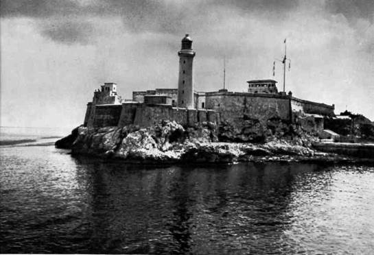 Таким образом, главнейшей заботой испанской короны на Кубе стала оборона Гаванской бухты, а точнее,— нагруженных богатствами кораблей во время их стоянки в бухте. Основные выделяемые Гаване средства — денежные, материальные, людские — направлялись на возведение мощного оборонительного вала для защиты бухты от вражеских флотов и пиратских кораблей, главным образом со стороны моря, но также и на подступах к бухте со стороны суши. Фортификационное строительство растянулось с середины XVI до конца XVIII века. Первая крепость Гаваны до нашего времени не дошла. Новую — Ла-Реаль-Фуэрса — начали строить в 1558 году рядом с центральной площадью поселения Пласа-де-Армас. Военный инженер Бартоломе Санчес придал крепости форму правильного квадрата с четырьмя симметричными бастионами по углам в окружении рва с водой. Строил форт и завершил его в 1577 году мастер Франсиско Калона. Крепостные стены, вырастая из воды, круто поднимаются к верхней платформе. Каменные блоки крупным масштабом подчеркивают мощь и неприступность форта. Верхняя площадка с трех сторон окружена жилым одноэтажным строением, в течение двух веков служившим резиденцией испанских правителей Кубы. <>
