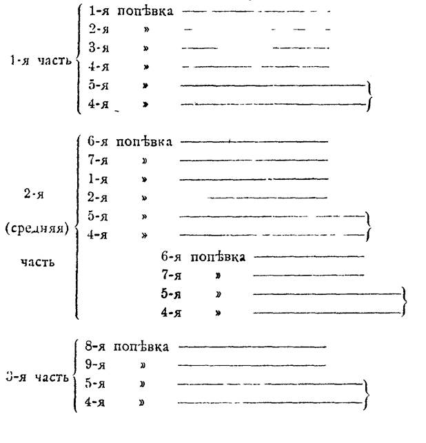 Таким образом песнопение должно в соответствии тексту, иметь так же трехстрочное построение. Такова-ли форма песнопения, покажет анализ его. Первая часть текста изложена в мелодии догматика 6-ю строками, причем заключением этого отдела служить комбинация из 4-ой и 5-ой попевок, которая — как увидим далее — является очень важным фактором в установлении формы целого.