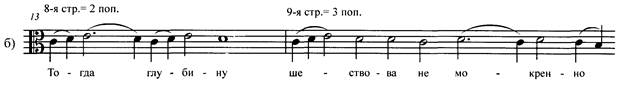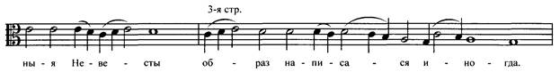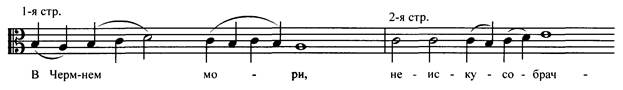 6+3» __________ 4» __________ 2» __________ 2 вар. __________ 4» __________ (Здесь – хотя и два, по внешности, разных построения (2-х и 3-х строчные), по существу совершенно уравновешивающихся, т. к. каждое заключает по одному и тому количеству попевок: 2, 3 и 4-ю в первом, и 5, 6 и 4-ю – во втором. Заключение обоих отделов 4-ой попевкой подтверждает это положение.)