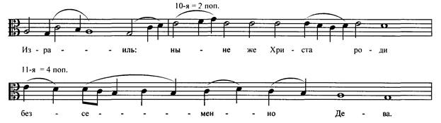 8-я стр. = 2 поп. Тогда глубину 9-я» = 3» шествова не мокренно Израиль: 10-я» = 2» ныне же Христа роди 11-я» = 4-й поп. безсеменно Дева.
