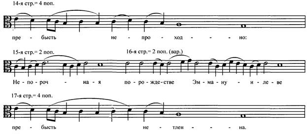 12-я стр. = 5 поп. Море 13-я» = 6+3 поп. по прошествии Израилеве 14-я» = 4» пребысть непроходно: 15-я» = 2» Непорочная 16-я» = 2 (вар.) по рождестве Эммануилеве 17-я» = 4» пребысть нетленна.