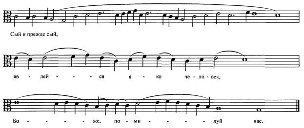 Форма – трехчастная, как в догматике 1, 2 и 3-го гл., но заключающая в себе черты особые, вполне своеобразные. К таковым следует отнести прежде всего трехстрочное построение, впервые только в настоящем догматике примененное. Как видно, это построение дано первой и третьей частям общей формы. Оригинальность такого приема тем заметнее, что он касается наиболее выпуклых частей целого. Та же трехстрочность имеется и в средней, - уравновешенная парностью фраз, в которых она применена. Что касается более обычного – четырехстрочного построения, то оно в данном Богородичне в свою очередь типично, во-первых тем, что в нем имеется повторение двух вполне схожих предложений, (прием еще не известный по прежним образцам); во-вторых тем, что в нем строго проведен принцип той же парности, какой и относительно трехстрочных построений. Вообще, в форме догматика бросается в глаза необыкновенность, точность и симметричность в соотношении частей: каждая из них стоит не особняком, а непременно имеет свою ответную фразу. Так, напр., началу отвечает заключение (то и другое – трехстрочное), первое «сопоставление образов» - второму, оба вместе – третьему, которое само по себе построено по той же схеме взаимно отвечающих друг другу фраз (трехстрочных) и т. п. Возвращаясь к мысли о соответствии гласов (1-го – 5-му и т. д.)[3], из сопоставления формы догматиков 1-го и 5-го гласов видим, что такое соответствие не подтверждается в большом знаменном распеве так же, как это было и в прочих распевах[4].