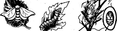1 2 3 4 Рис. 3.23. Тутовий шовкопряд. Розвиток з повним перетворенням: 1 – метелик, що відкладає яйця; 2 – гусениця; 3 – кокон; 4 – лялечка в коконі.
