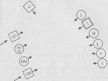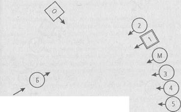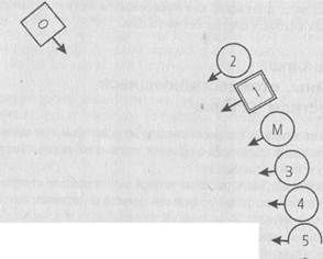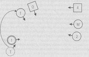 Рис.,17.1: Ч—^ О - отец; М - мать; 1 — первый ребенок (Томас); 2 — второй ребенок, дочь; 3 — третий ребенок, дочь; 4 — четвертый ребенок, дочь; 5 — пятый ребенок, дочь. Б.Х. (участникам, исполняющим роли членов семьи Томаса): На кого вы все злитесь? Второй ребенок: На отца? Б.Х: Нет. (Томасу): На Бога. Спрашивается только, является ли это божество мужчиной или женщиной. Томас: Я не знаю. Это трудно определить. Б.Х.: Когда в ходе расстановки словно ощущается присутствие божества, это означает, что один из членов семьи отождествляется с ним. Томас: Тогда это мужчина. Б.Х: Я в этом не уверен. Как чувствует себя отец? Отец: Очень плохо. Я смотрю в пустоту и не имею ничего общего с остальными. Б.Х.: Да, действительно, посланная тебе милость не помогла. (Участнице, исполняющей роль матери): Как чувствует себя мать? Мать: Просто ужасно. Б.Х. (исполняющему роль Томаса): Как чувствует себя сын? Первый ребенок: Плохо. Мне хочется отсюда уйти. Второй ребенок: Я чувствую большую нагрузку. Словно я мать-одиночка. Третий ребенок: У меня нет никаких особенных чувств. Четвертый ребенок: Мне хорошо, потому что я тоже ничего не чувствую. Больше мне нечего сказать. Б.Х. (Томасу): Расскажи нам о семье своего отца. Томас: Мой отец был самым старшим. Кроме него в семье было еще семеро детей. Он управлял одним торговым домом, который принадлежал отцу моей матери, а моя мать была и все еще остается там на главных ролях. Б.Х.: Кроме того, что в семье было так много детей, произошло ли в ней что-либо важное? Томас: Одна из сестер отца умерла от туберкулеза. Двое самых младших братьев были близнецами. Один из них свалился с лестницы и умер. По желанию его матери мой дед должен был стать священником, но его дед это предотвратил. Б.Х: Значит, дед твоего деда это предотвратил? Томас: Да, если бы дед моего деда этого не предотвратил, он стал бы священником. И я, и мой отец должны были стать священниками по желанию своих матерей. Я только хочу сказать, что в нашем роду все матери хотели, чтобы их сыновья стали священниками, но отцы или деды это всегда предотвращали. Б.Х.: Хорошо. Как ты думаешь, божество в твоей семье мужчина или женщина? Добавь его в расстановку! Томас: Кого? Б.Х.: Это божество. Кто же оно? Томас: Сейчас я бы добавил в расстановку женщину. Б.Х.: Хорошо, выбери одну из женщин на роль божества. (Группе): Не удивляйтесь. Здесь мы имеем дело только с людьми, играющими определенную роль. Б.Х.: Что изменилось для вас?